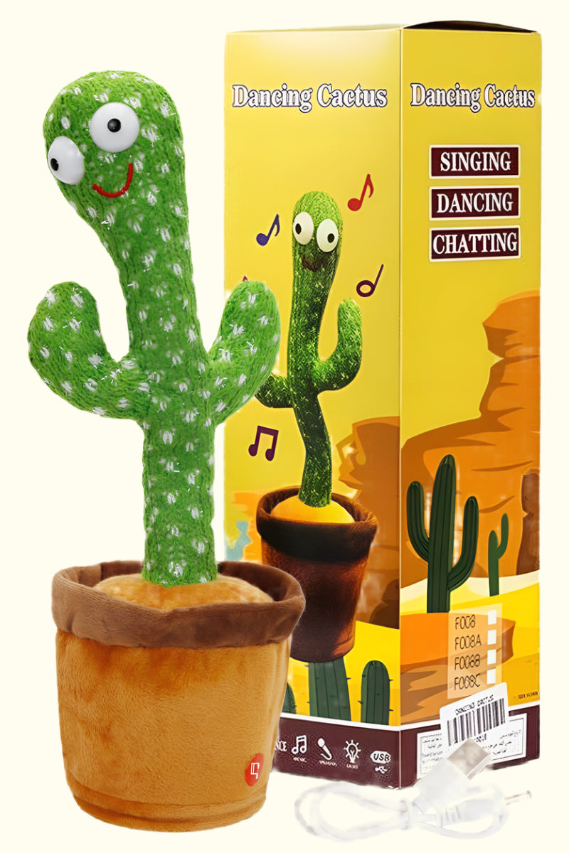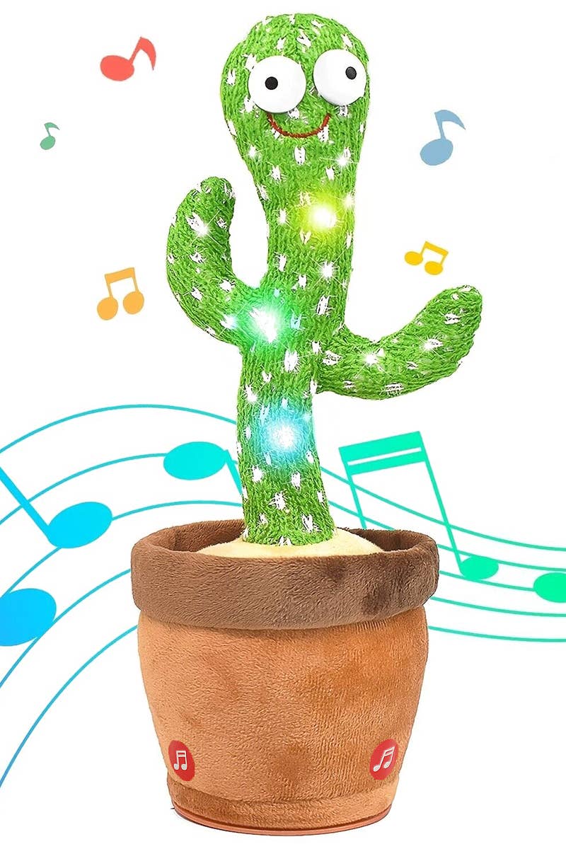 This lively cactus plush toy measures 12" by 4" by 4" and features wiggling, dancing movements, sound mimicry, and music-playing LED lights for endless playful fun.
