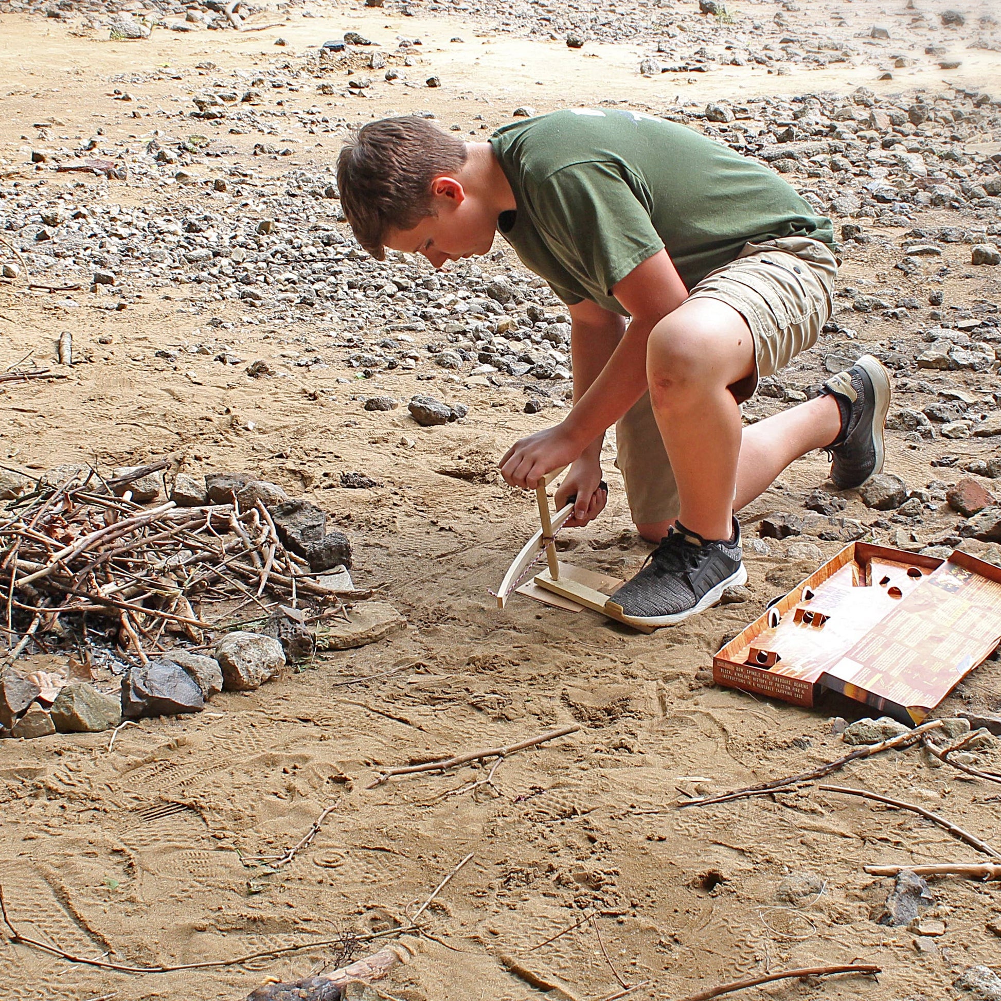 The authentic friction-to-flame tool set. Everything needed to start a fire using the traditional bow drill method. Includes pre-strung bow drill, kiln-dried fireboard and spindle, bearing block, kindling rope & instructions in a carrying case.