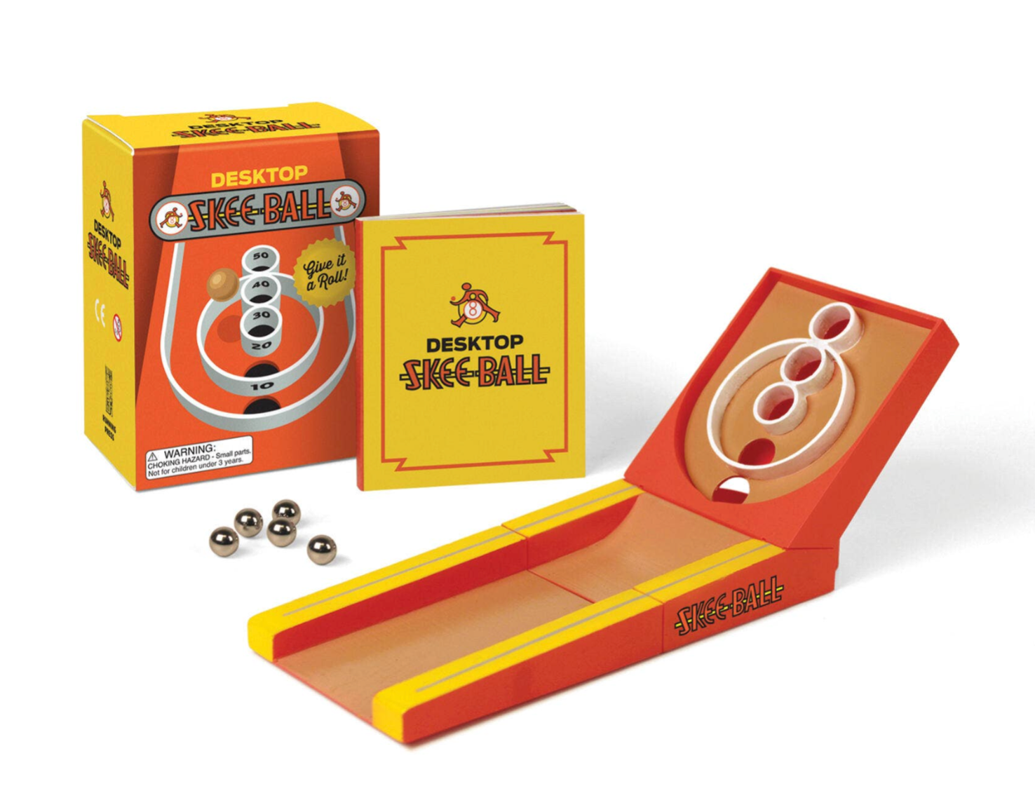 This mini Skee-Ball set comes with three snap-together parts, five balls, and a colorful 32-page illustrated guide to get you rolling and scoring in no time!
