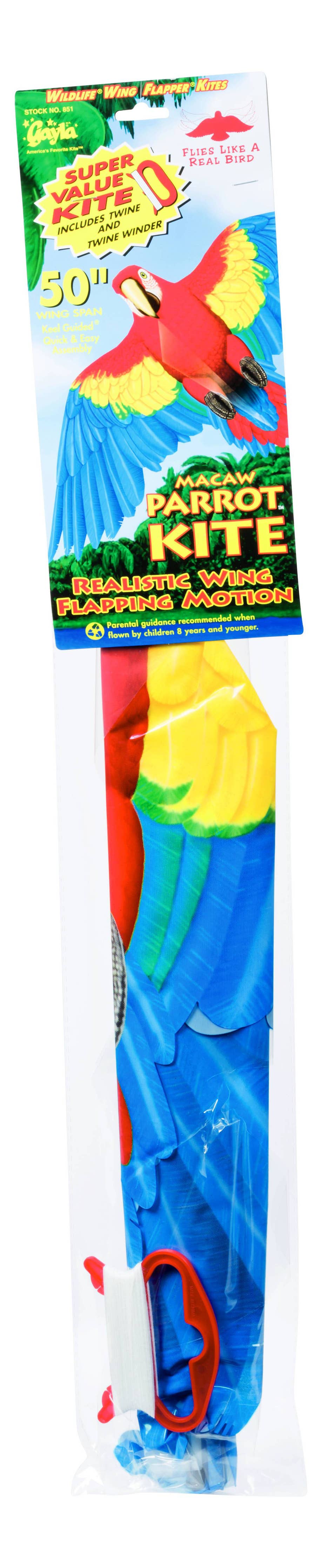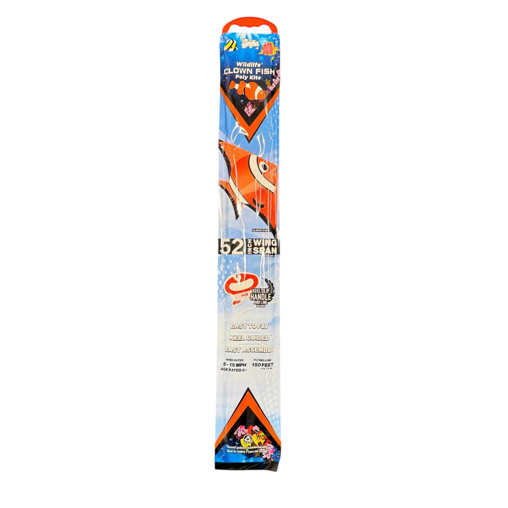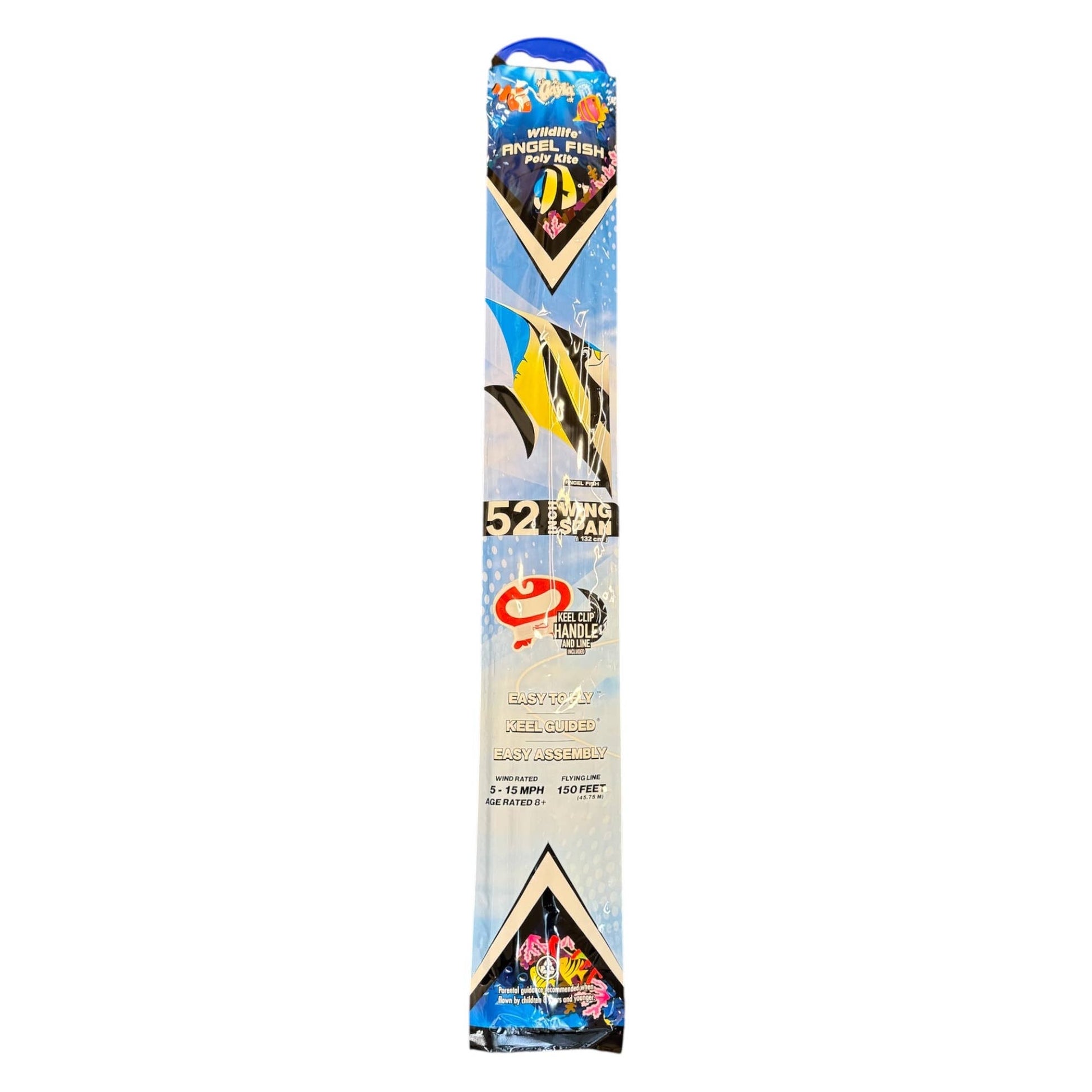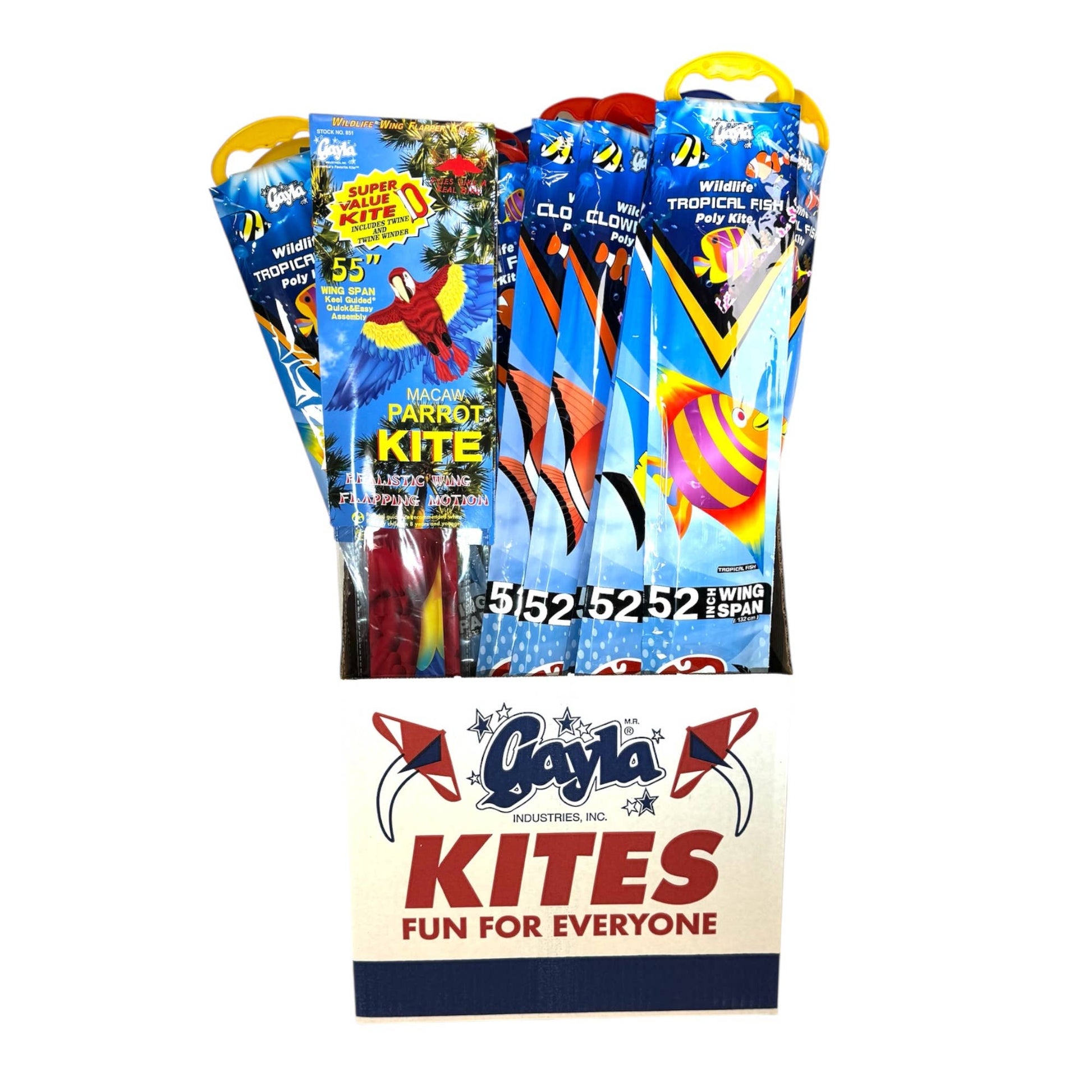 Enjoy a day at the beach while flying these shaped kites with exquisite detail and color. Kites have a wingspan that measures over 50" with lifelike flapping motion. Assortment includes angel fish, clownfish, tropical fish and macaw, each with a keel clip handle and 150' of flying line.