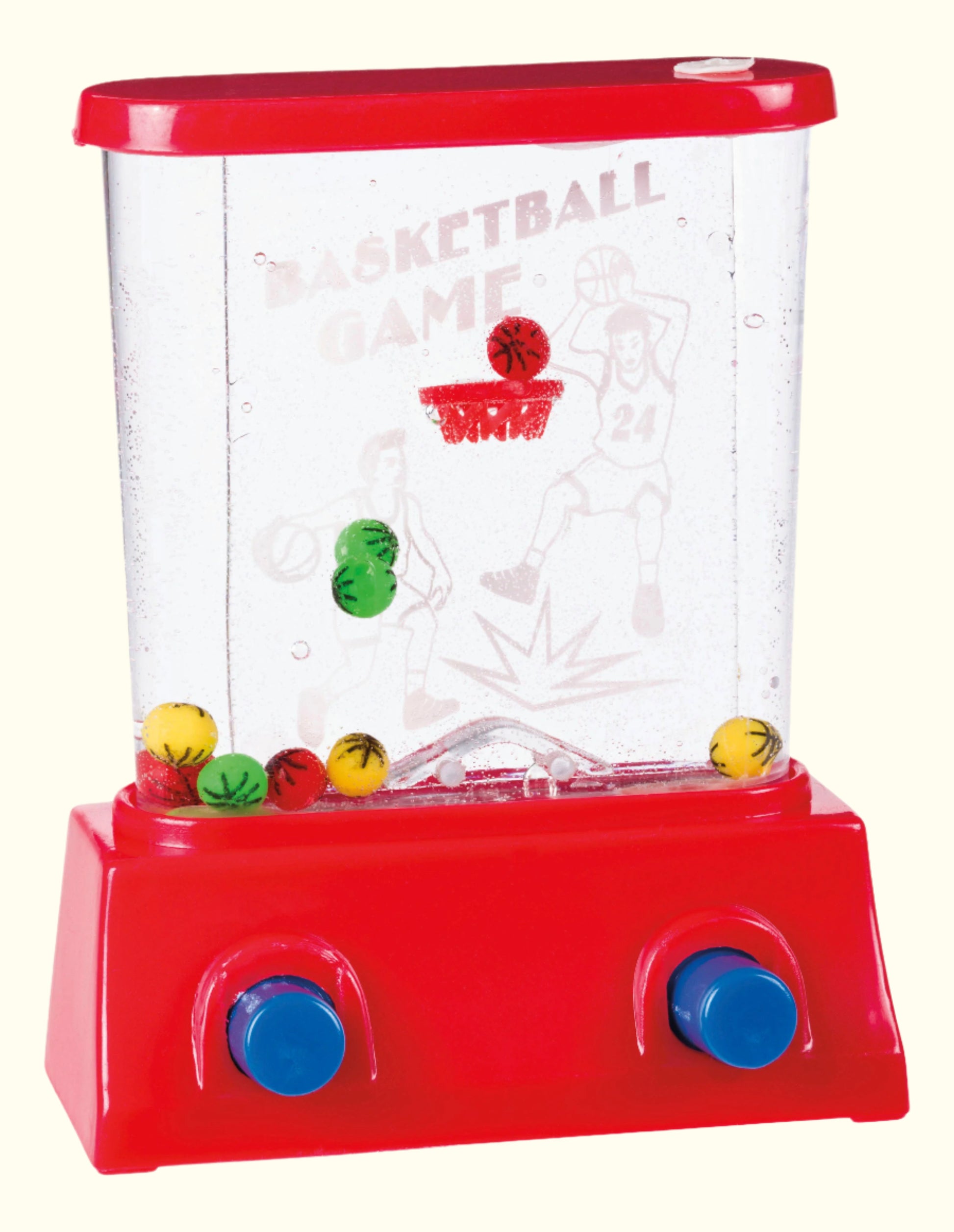From On the Way Games comes an assortment of miniature handheld water arcade games. These mini water arcade games come in 3 assorted colors and 2 game options. Pick either the blue or orange basketball score game and see how many colored balls land in the basket. Or choose the red and blue fish food ring toss game. Both games are thumb-button-powered. Just add water to play these travel-sized games for hours of entertainment through the removable top.