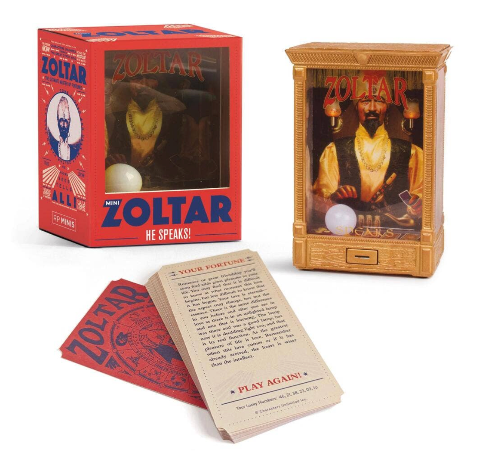 Inspired by the famous all-knowing animatronic fortune teller, this mini talking Zoltar brings his mystical advice right to your space. Standing just 4" tall, this clear plastic replica of the legendary Zoltar sits inside his classic booth. Press a button to hear him speak clever fortunes while his booth’s lights flicker and his crystal ball glows. Includes 16 fortune cards for extra guidance and wisdom. Its compact size makes it perfect for fun and fortune wherever you go!