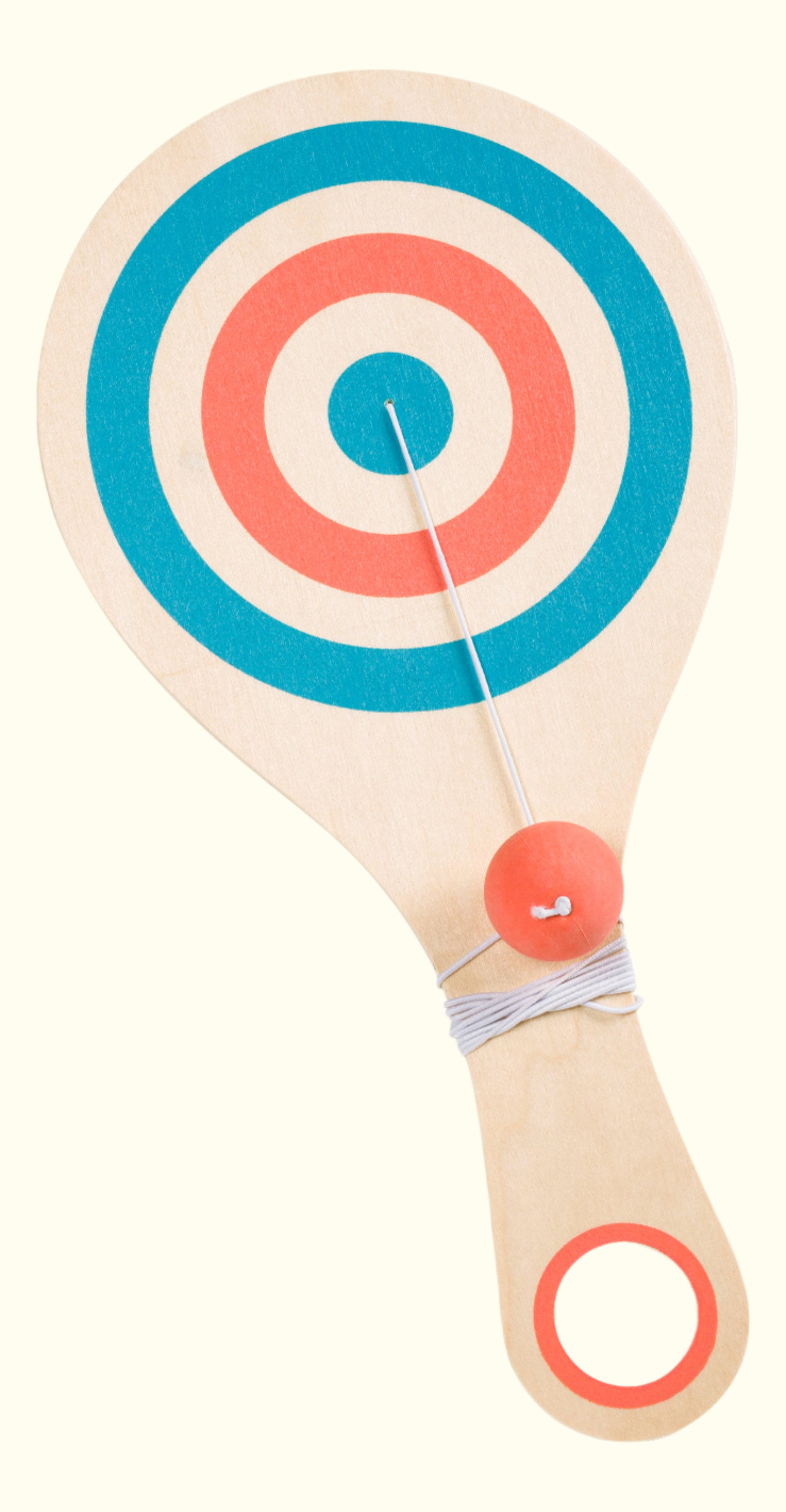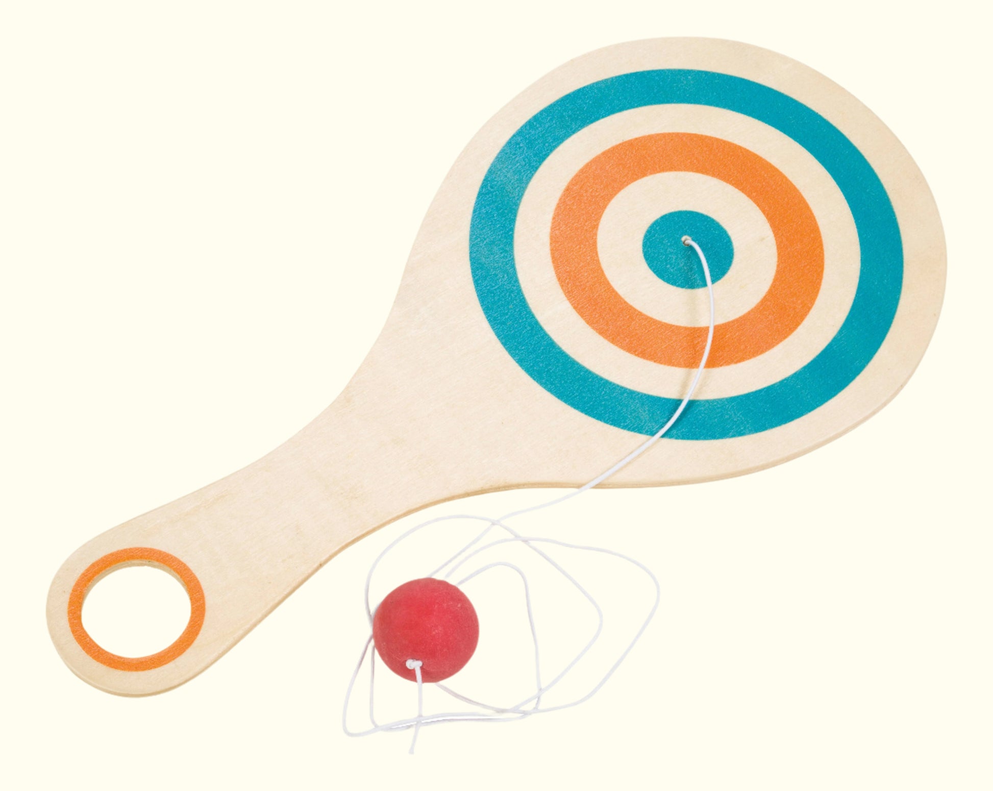 This nostalgic wood paddle ball game returns to popularity thanks to Neato!.Bounce-Back Paddle Ball game is made for 1-person play and suitable for kids 5+. Each bounce-back paddle toy is made with high-quality, no-splinter wood. A small bouncy ball is attached to the middle with a string. The wooden paddle also features a painted-on target with two rings and a bullseye dot. The paint is nontoxic, and the colored rings are blue and orange. A great toy to work on hand-eye coordination, waylay boredom, and reduce stress.