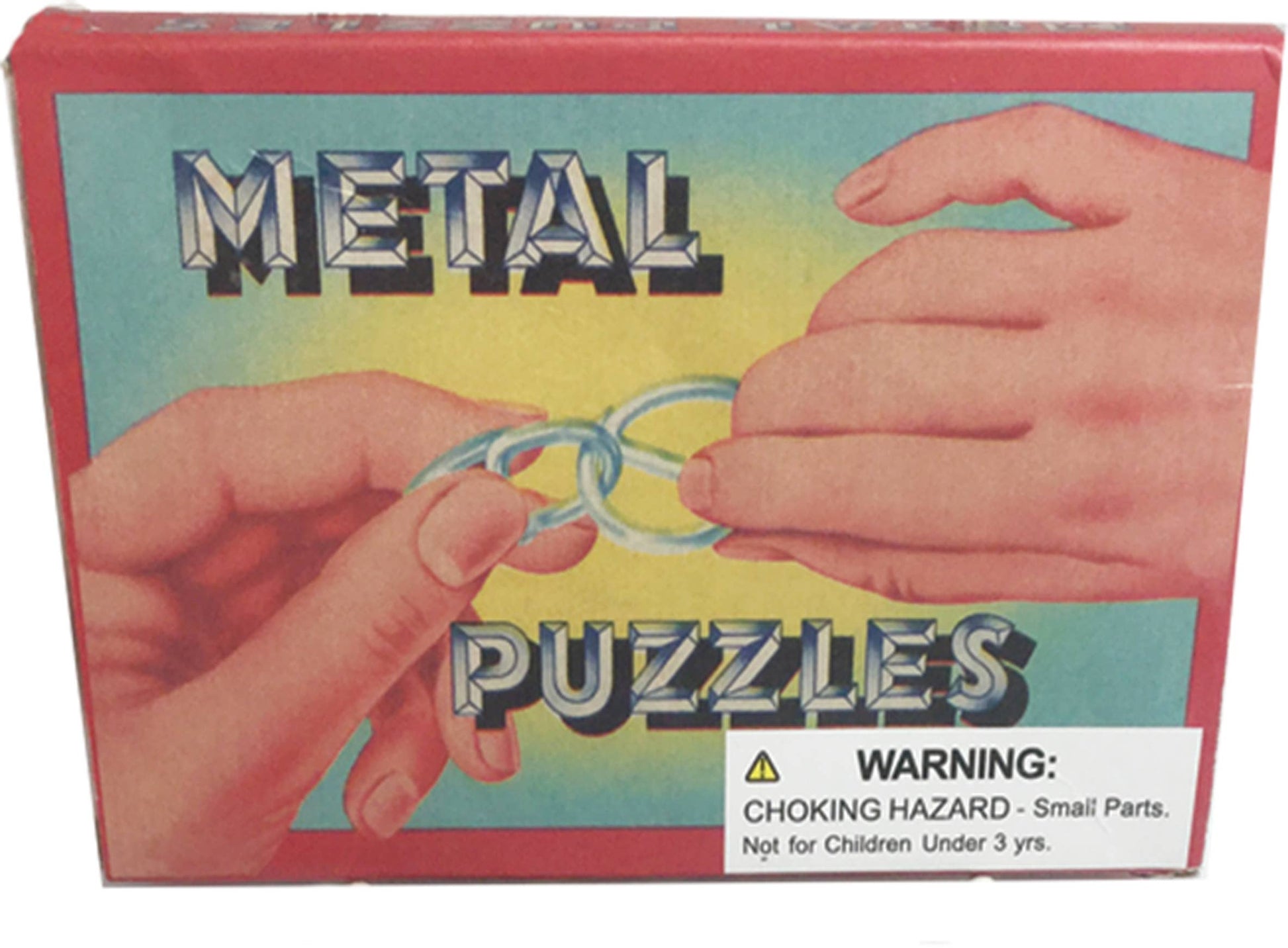 Enjoy a quirky collection of metal puzzles designed to stump and entertain puzzlers young and old. Comes with a solution guide that’s a bit mysterious—good luck figuring it out! Perfect for ages 6 and up. Box measures 6” x 4” x 0.75”.