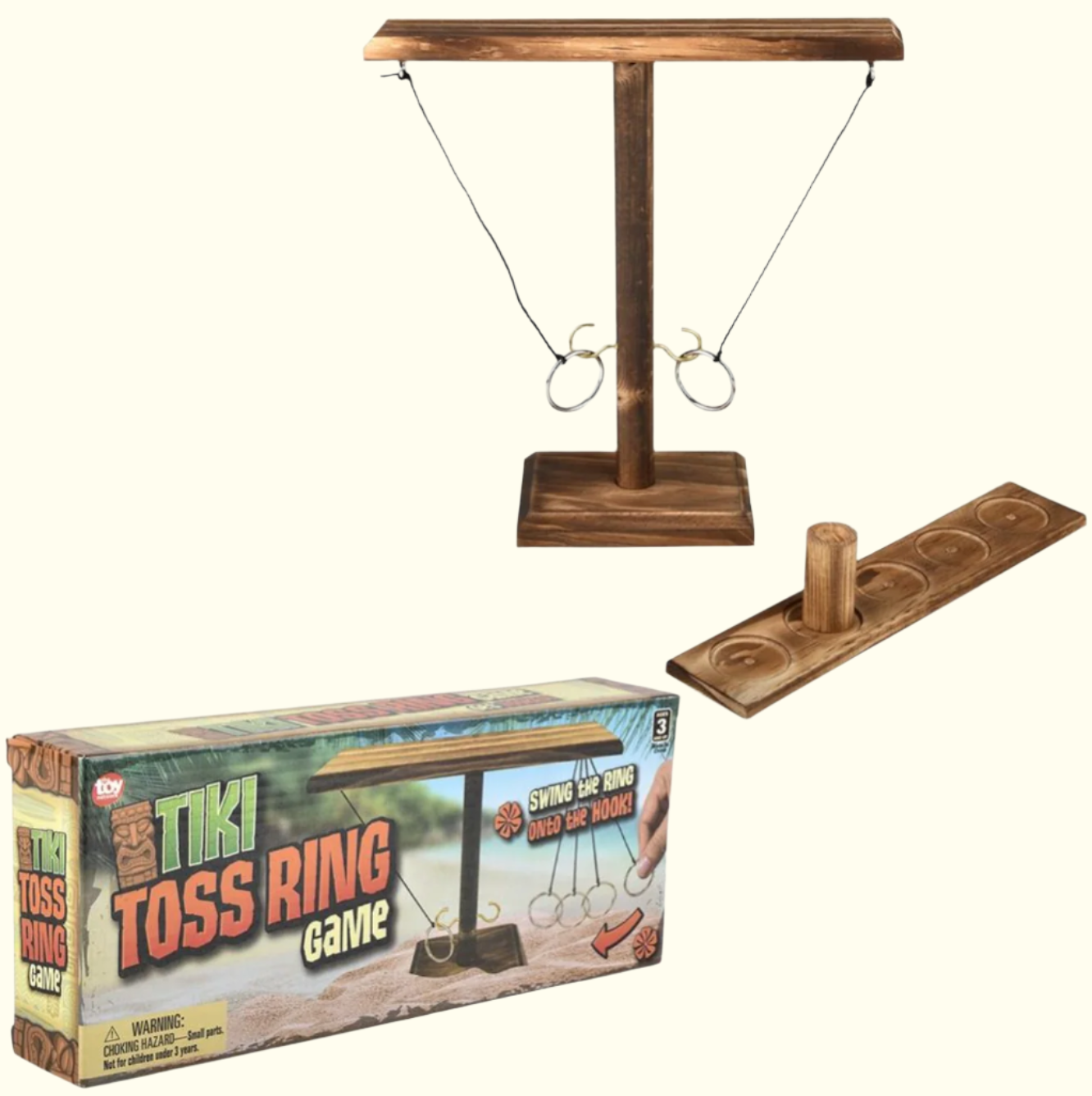 This mini version of a classic bar game stands 10.5" tall and 10" wide. Each arm holds a string with a metal ring, and the goal is to swing the ring onto the hook on the upright bar. It’s a lively game to enjoy with friends! The wooden board features five indents and a cylinder that acts as a scorekeeper. Start with the cylinder in the center, then swing the rings to catch the hooks and move the cylinder toward you. The first to get the cylinder to their side wins the game! Box size: 10.5" x 4" x 1.75".